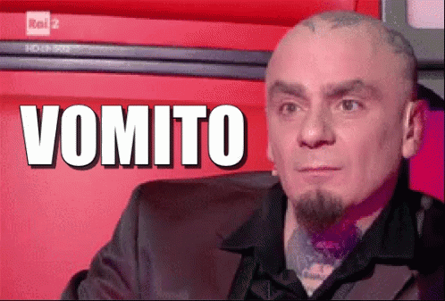 J-Ax reacts with a disgusted expression in front of a red wall with 'VOMITO' text, from The Voice Of Italy.