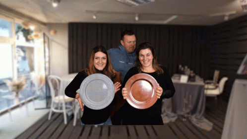 Two women and a man at Vonrock Events, holding decorative plates and smiling for the camera.