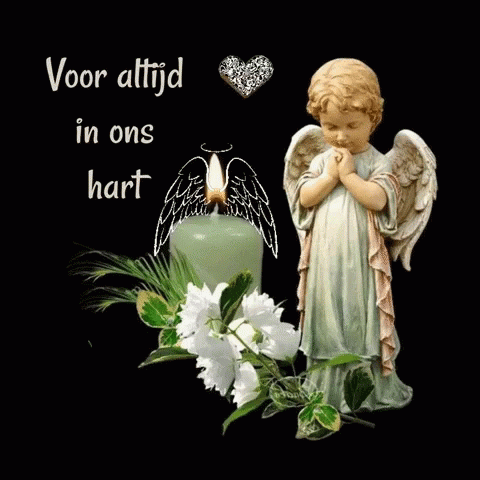 An angel statue praying next to a candle with the text 'Voor altijd in ons hart' (Forever in our heart).