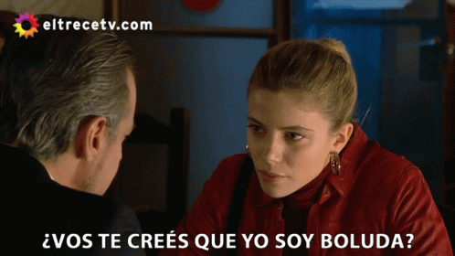 Justina Bustos confronts a man, asking 'Do you think I'm stupid?' in a dramatic scene.