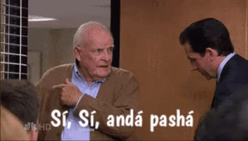 An older man points and tells Michael Scott "Sí, Sí, andá pashá" (Yes, Yes, go away) in a dismissive manner.