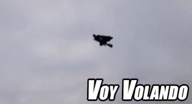 A drone disguised as a witch on a broomstick flies through a cloudy sky, with the text 'Voy Volando' displayed.