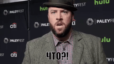 A man with a beard, hat, and suit reacts with a shocked expression, exclaiming "WHAT?!".