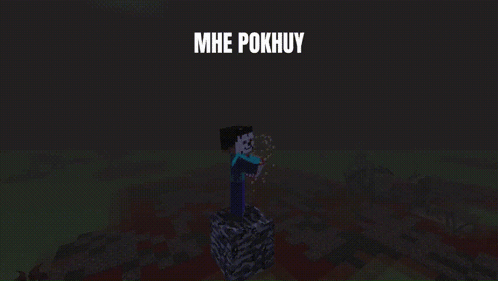 Minecraft character Steve on a block, with the text 'MHE POKHUY' (I don't care) displayed.