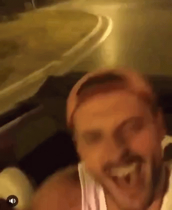 Vso Pex, the rapper, joyfully laughs and waves his arm while riding in a car at night.