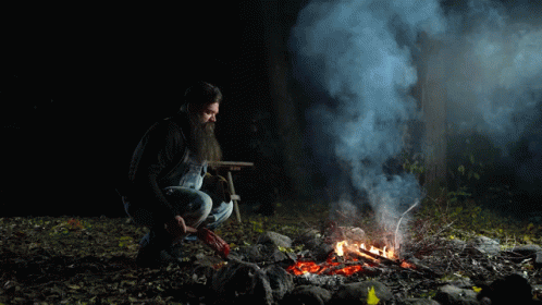 Vtc Viking The Chef, Vylius Lauzas, tending to a smoky campfire at night.