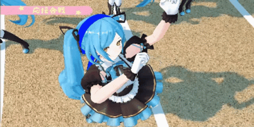 Vtuber Yamato Iori and her clones perform a synchronized cheer dance in maid-like outfits for a cheer battle.