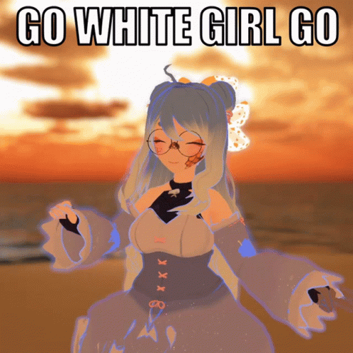 An anime-style VTuber character dances energetically on a beach with a sunset, featuring the text 'GO WHITE GIRL GO'.