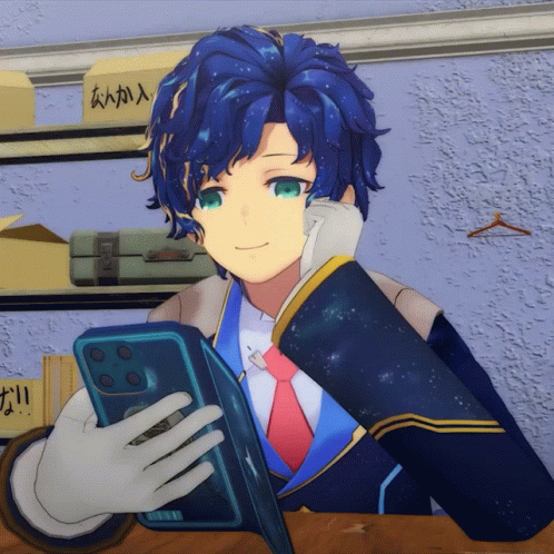 Astel Leda, the blue-haired Holostars VTuber, smiles while looking at his phone, resting his head on his hand.