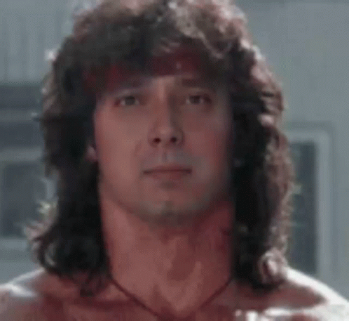 Close-up of Vučić impersonating Rambo, featuring long curly hair and a red headband.
