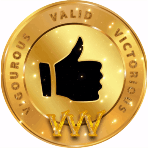Animated gold coin featuring a thumbs-up and 'Valid Vigorous Victorious' text, transforming into 'VVV'.