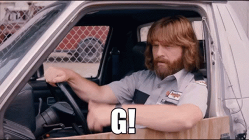 Zach Galifianakis as Alan Garner gives a cheerful thumbs-up from his truck, with a bold 'G!' caption.