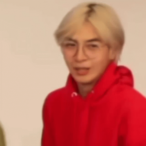 VXON member Franz in a red hoodie and glasses, giving a curious and slightly skeptical look.