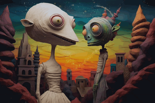 Vyd3n's unique pop-art surrealism animation featuring two distinct, alien-like characters in a vibrant, otherworldly landscape.