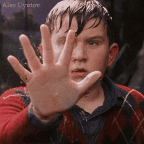 Dudley Dursley from Harry Potter makes a distressed 'stop' gesture, shouting 'Let Me Out!' with wet hair.