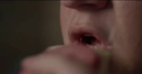 Evgeniy Kulik in a close-up shot, bringing a sandwich to his mouth to eat.
