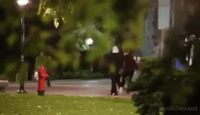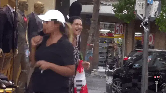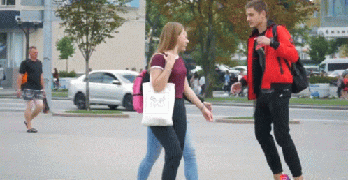 Man in red jacket playfully picks up a woman with a white tote bag and runs away as a street prank.