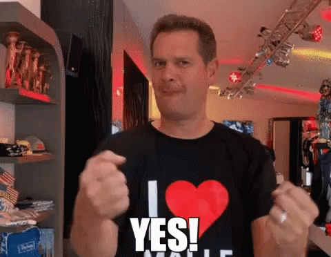 Peter Wackel flexes his biceps with a confident smile, wearing a black 'I ❤️ YES!' shirt.