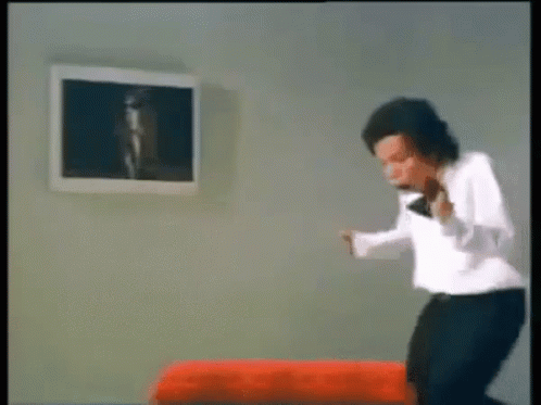 Dono from Warkop DKI reacts dramatically to a mysterious picture on the wall with exaggerated expressions.
