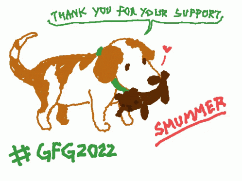 Waffles the dog holding a toy, with a message of thanks and #GFG2022 from Smummer.