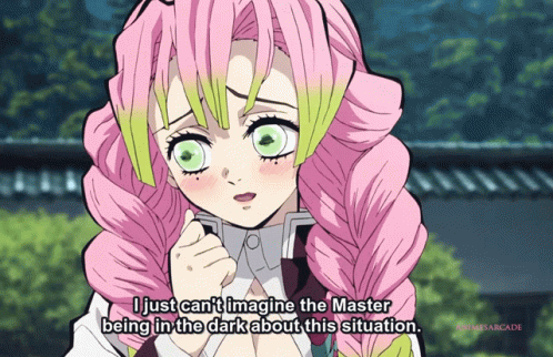 Mitsuri Kanroji, the Love Pillar, with pink and green hair, expresses concern about the Master's awareness.