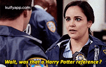 Amy Santiago, in police uniform, looks at a colleague and asks if a Harry Potter reference was made.