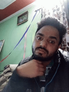 A man with a beard makes a funny, wide-eyed face while holding his hand to his chin.