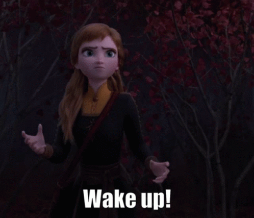 Princess Anna from Frozen 2 in a dark forest, urgently calling out 'Wake up!'