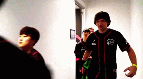 Meteos of 100 Thieves performs a silly walk down a hallway, joined by his group of gamers.