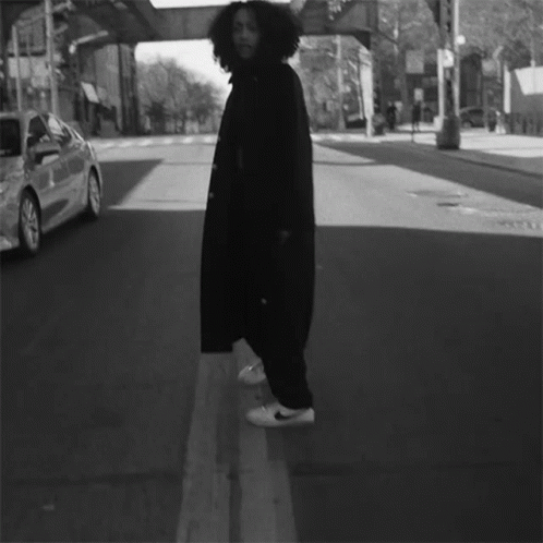 Jenevieve walks confidently down an urban street in black and white, wearing a long coat and white sneakers.