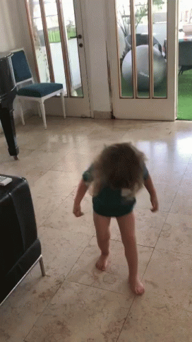 A cute toddler with curly hair energetically dances and headbangs in a living room.