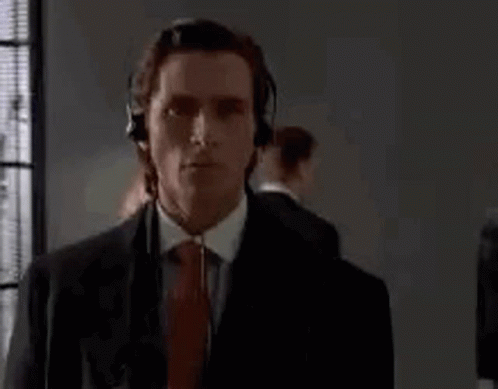 Patrick Bateman in a suit and tie, wearing headphones and walking with a serious expression.