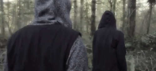 Two hooded figures walk through a dense, foggy forest, evoking a sense of being lost and contemplative.