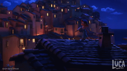 Giulia and Luca Paguro walk across the rooftops of a charming Italian Riviera town at night, illuminated by warm lights.