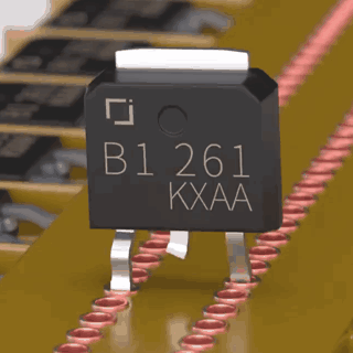 A 2SB1216 walking-transistor, labeled B1 261 KXAA, moves its pins on a circuit board.