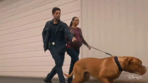 Scott Turner and Jessica Baxter walk a large brown dog on a leash, with a Disney+ logo visible in the background.
