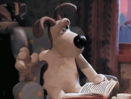 Gromit from Wallace and Gromit sits in an armchair, reading a book and looking thoughtful.
