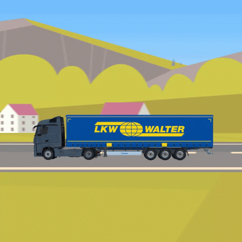A blue and yellow LKW Walter semi-truck drives along a road with a scenic background of hills and houses.