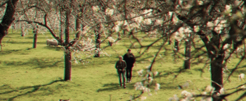 Wanda Maximoff (Scarlet Witch) and Stephen Strange (Doctor Strange) walk through a beautiful blossom field.
