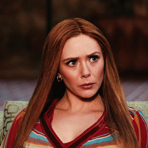 Wanda Maximoff, portrayed by Elizabeth Olsen, shows a surprised and concerned expression.