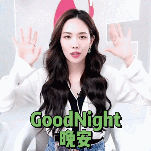 Wangfeifei (王霏霏) bids goodnight with a sweet gesture, wishing everyone a peaceful sleep.