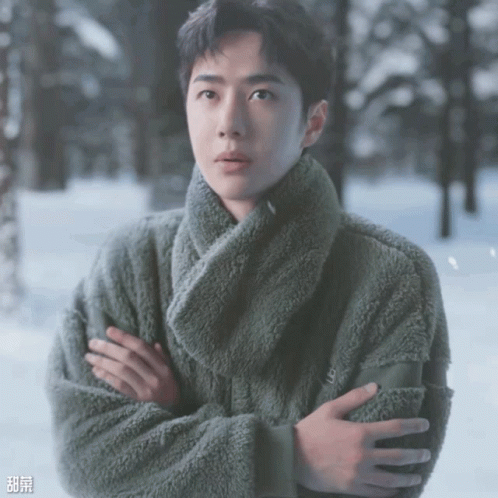 Wang Yibo looks cozy and thoughtful in a snowy winter landscape, bundled up in a warm, textured jacket.
