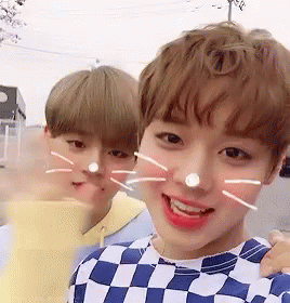 Wanna One members Park Jihoon and Lee Daehwi smile for the camera with a cute Snapchat cat filter.