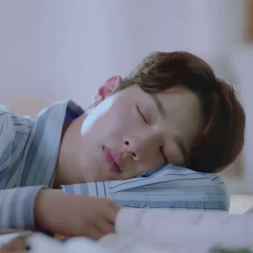 Wanna One's Kuanlin sleeps peacefully on a bed, resting his head on a striped pillow.