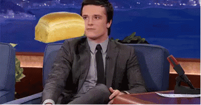 Josh Hutcherson, wearing a suit and tie, sits in an armchair, giving an expressive reaction during an interview.