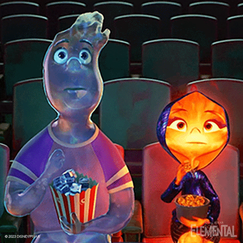 Ember and Wade from Disney Pixar's Elemental enjoy popcorn together at the movie theater.