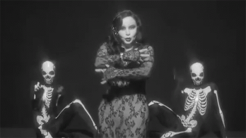 Alaska from Fangoria performs in a black lace dress, surrounded by dancing skeletons, with electric sparks emanating from her hands.