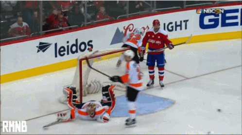 Washington Capitals player Evgeny Kuznetsov celebrates a goal with his signature dab on the ice.