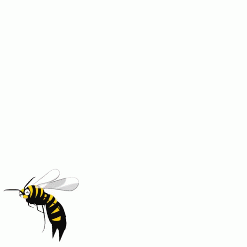 An animated cartoon wasp with black and yellow stripes flies across a plain white background.