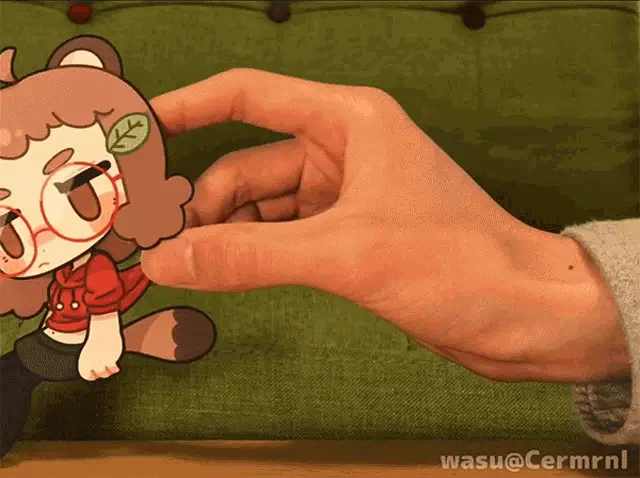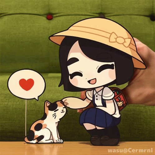 Chibi-style girl in a straw hat gently pets a cute calico cat, with a heart bubble, by artist Wasu.